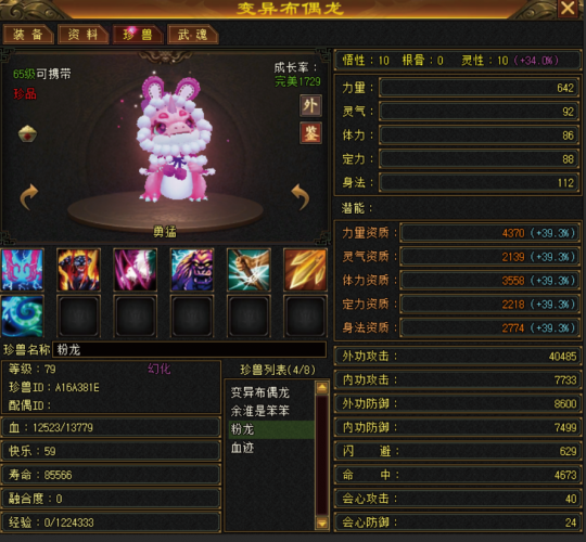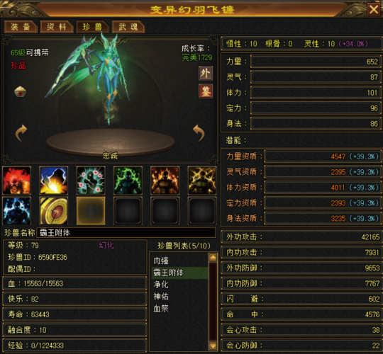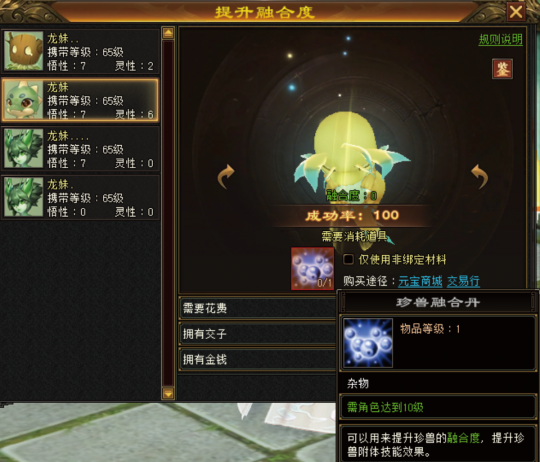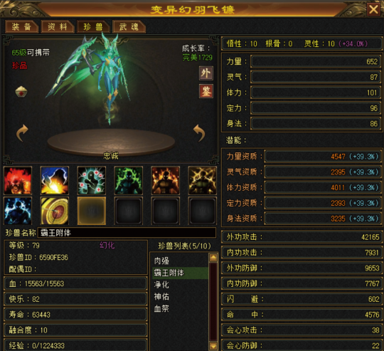 珍獸附體介紹 當世界等級來到98級時,開啟珍獸附體玩法。 來到蘇州云四合處,完成簡單的附體教學任務,即可開啟附體功能。 珍獸附體不僅可以給人物增加屬性,還可以增加附體幻化效果。(站街必備) 完成珍獸教學任務技能欄會多兩個技能,一個是附體,一個是分離。 一般我們常用珍獸界面的附體和分離,可以更好的選擇珍獸。 珍獸的種類 天龍歸來的珍獸有很多種,總體可以分為四類: 外功型珍獸、平衡型珍獸(也就是常說的體力珍獸和身法珍獸)、內功型珍獸 外功型珍獸:力量資質最高、體力資質、身法資質也較高 平衡型珍獸:體力資質最高、力量資質、身法資質略顯不足 內功型珍獸:靈氣資質最高、體力資質、身法資質略顯不足 平衡型(身法)珍獸:身法資質最高、體力、力量資質略顯不足 外功型珍獸 平衡(體力)型珍獸 內功(體力)型珍獸 超靈珍獸 超靈珍獸:相同靈性是10的情況下,超靈珍獸的資質加成比一般的寶寶多3% 玄翼獸非超靈寶寶 靈性10的資質加成為31% 糖果甜心為超靈寶寶 靈性10的資質加成為34% 當前超靈寶寶: 布偶龍65、75級 幼齒龍 窮奇85級 狐妖劍君65、75級 幻羽飛鐮65、75、85、95級 劍影虎 糖果甜心65、75、85、95級 九霄戰龍65、75級 木呆呆65、75、85、95級 玄海馬65、75級 碎巖巨獸95級 小花靈65、75級 蛋蛋雞 附體珍獸的選擇 當我們選好外功型、超靈類型的珍獸之后,下一步就要看珍獸的資質和成長率了。 用幾十組數據推測了一下附體加成的近似公式: 附體的加成屬性= (成長率x成長技能系數+資質x資質技能系數)÷常數?x 融合度系數 x 珍獸等級 (僅個人推測有誤差,不代表官方數據) 技能系數:低級技能、高級技能、超級技能1、2、3、4級每一個等級,技能系數都不一樣) 由上述公式可知: 相同等級和融合度的情況下,附體的成長率越高、資質越高、加成的效果越好。 附體加成的屬性和性格、變異等級、加點、珍獸套裝無關 附體胚子珍獸的選擇: 1、不看珍獸的性格 2、成長率選擇大完美的(如65級選擇1729) 3、資質理論上是越高越高,一般選擇2143以上即可,雙十之后可以達到4000資質。 珍獸資質的計算 看到一只珍獸,想計算珍獸雙十有多少資質。 珍獸資質的計算方式為: 基礎資質x(1+0.393)x(1+0.34) 悟性10加成39.3% 靈性10加成34% 如果看中的珍獸沒滿雙十:(例如悟性7,靈性6) 先還原基礎資質: 2852÷1.145÷1.15≈2166 2166x1.393x1.34≈4043 那么這只珍獸雙十的資質為4043。 附體珍獸推薦 65級推薦:幻羽飛鐮、布偶龍、狐妖劍君 85級推薦:幻羽飛鐮、布偶龍、幼齒龍、狐妖劍君、窮奇 95級推薦:幻羽飛鐮、布偶龍、幼齒龍、狐妖劍君、劍影虎 像呆呆牛、暴龍、雷麟、忍者神瓜、兔小妖等寶寶.. 這些不是超靈寶寶,靈性加成31%。資質高的話也可以用。 附體技能打造 珍獸附體技能書獲取 1、元寶店、交易行、寶圖鑰匙、馬賊、周活躍寶箱都可以獲得! 珍獸附體技能介紹 附體技能分為低級技能、高級技能、超級技能1、2、3、4級。 每一種等級加成的系數都不一樣,越高越好。 生活玩家一般主屬性和血量3級,其他的一級就夠了。 圖中玄是超級4級,冰、火、毒為超級1級 珍獸附體技能打造 天龍歸來珍獸技能可以有6個被動, 先用便宜的5J技能書開6個格子,能省很多。 然后用低級的附體技能書去把技能調整好。 當用低級的技能調整完,在依次用高級技能打上。 高級技能書可以覆蓋低級的技能書。 打完高級技能可以用靈獸丹·合去升級。 高級技能可以升級成超級技能。 超級技能1級:需要1個。 超級技能2級:需要5個。 超級技能3級:需要25個。 超級技能4級:需要125個。 一個技能上到4級,共需要156個。 珍獸悟性提升 附體效果的加成和珍獸的資質掛鉤,所以需要提悟性、和靈性。 到蘇州云霏霏處提升悟性, 需要低級根骨丹、中級根骨丹、高級根骨丹。 低級根骨丹和中級根骨丹可以在商會用交子買高級根骨丹可以在元寶店和交易行購買 珍獸悟性的建議 一般悟性7級很好上, 用交子和日常獲得的根骨丹就可以了。 悟性7上10,穩住心態。 一般存20個去點一下,或者存100個去點一下。 (切記不要上頭,每天只能點400下) 土豪大哥隨意,直接一鍵上10。 珍獸靈性提升 到蘇州云思兒處提升靈性,提靈性之前需要先幻化。 在交易行買一個幻化丹,即可幻化。 靈性的提升失敗不會掉,前8級,可以直接提升。 后面成功率低, 可以攢50個,或者100個去提。 (靈性提升單個珍獸,連續失敗100次,下一次必定成功。) 珍獸融合度提升 當悟性和靈性提升后,附體的最后一步便來到提升融合度了。 1、提升融合度可以增加附體的屬性加成 2、提升融合度可以增加附體的幻化效果 提升融合度需要珍獸融合丹,元寶店、交易行都可以買到。 但要注意一點,融合度的等級,不能超過悟性和靈性的最小值。 舉個例子: 如龍妹的珍獸悟性是7級,靈性是6級。那么融合度最高只能到6級。 融合度的提升相對來說比較好提一點,幾率大。 (目前最好戰績是17個融合丹上10) 當悟性、靈性、融合度全部到10,附體技能全部打完, 附體的等級提升到最大等級時。 一只三十附體就打造完畢了。 注意: 1、三十附體的價值是目前游戲內最高的。 2、三十附體的流通性也很高。 生活玩家一開始做一個悟性8、靈性8、融合度8也可以帶著過渡。 珍獸幻化 當附體一個三十珍獸時, 身上會出現一個初始外觀(綠圈圈) 融合度0-9,效果比較低, 融